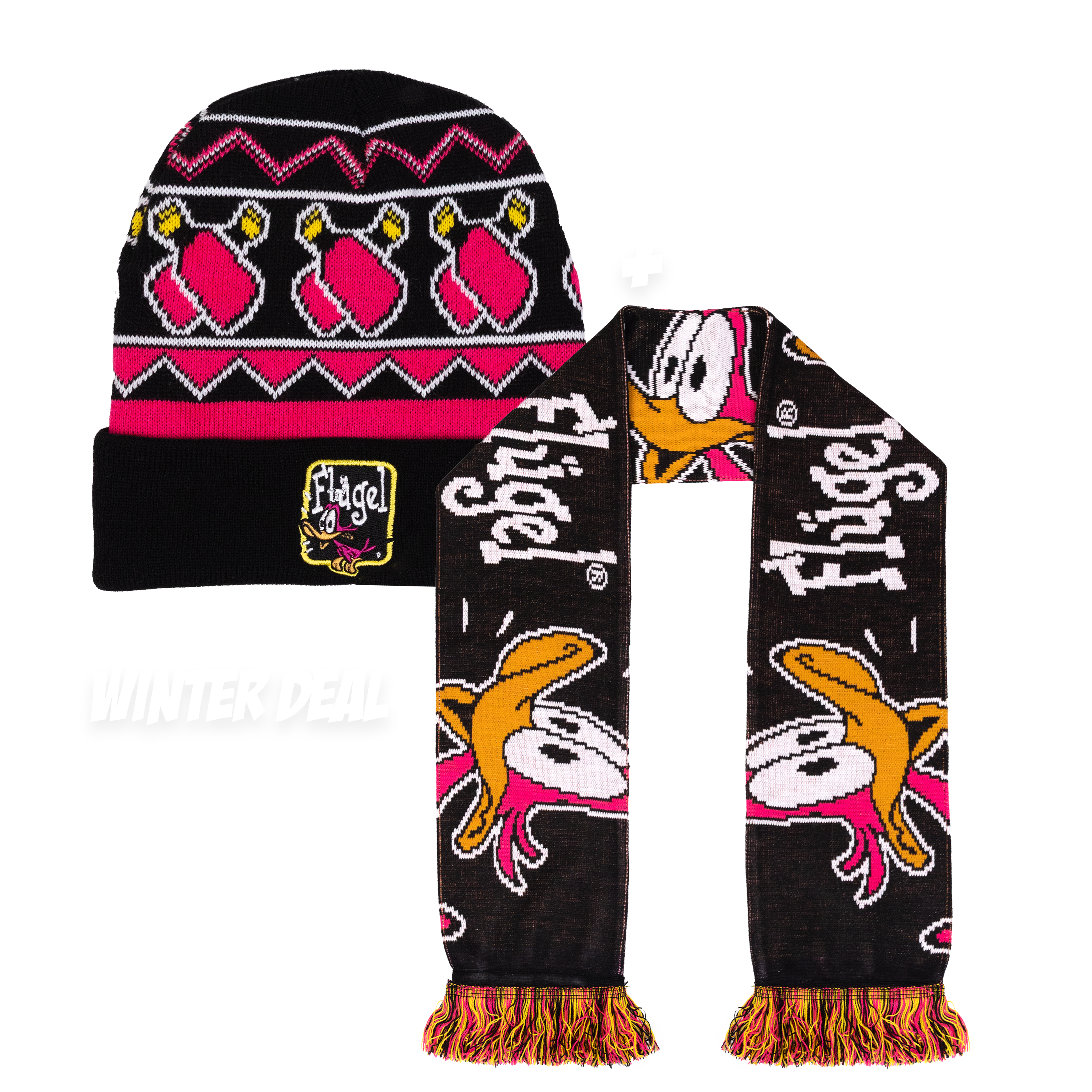 Deze perfect op elkaar afgestemde Flügel muts en sjaal houden je niet alleen warm tijdens koude dagen, maar zorgen ook voor dat je zeker opvalt. Op beide items vind je het iconische eendje terug. Warm blijven tijdens de koude dagen? Scoor dan zeker deze set!