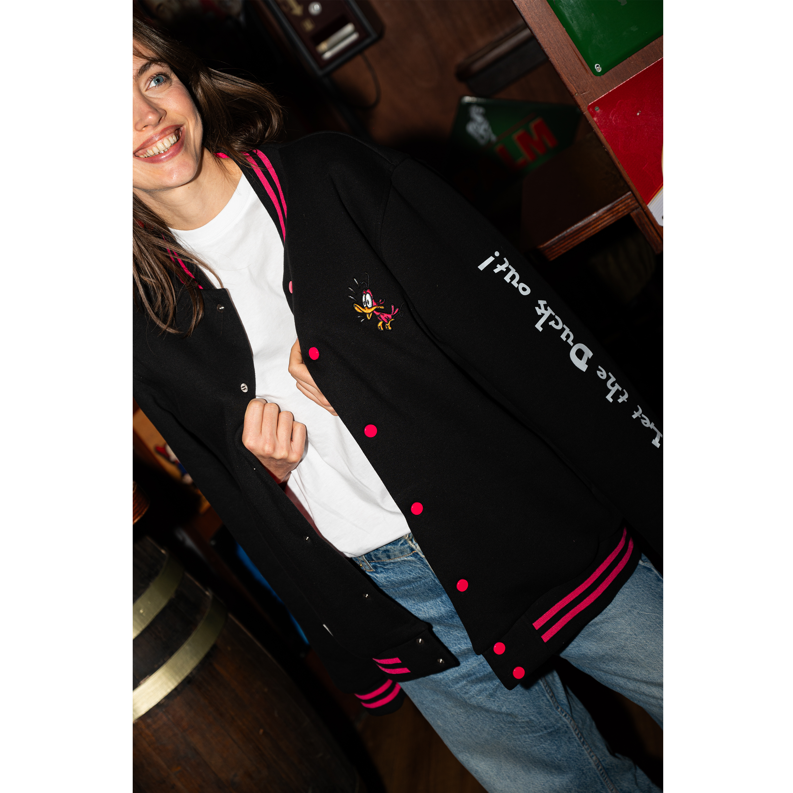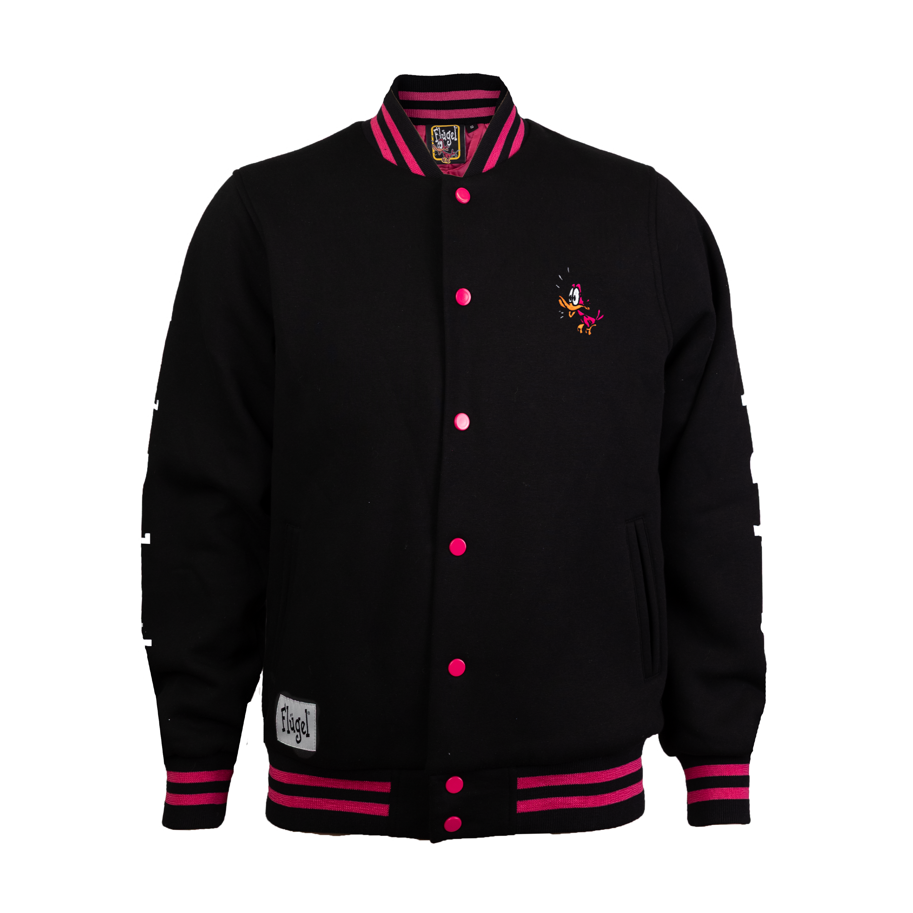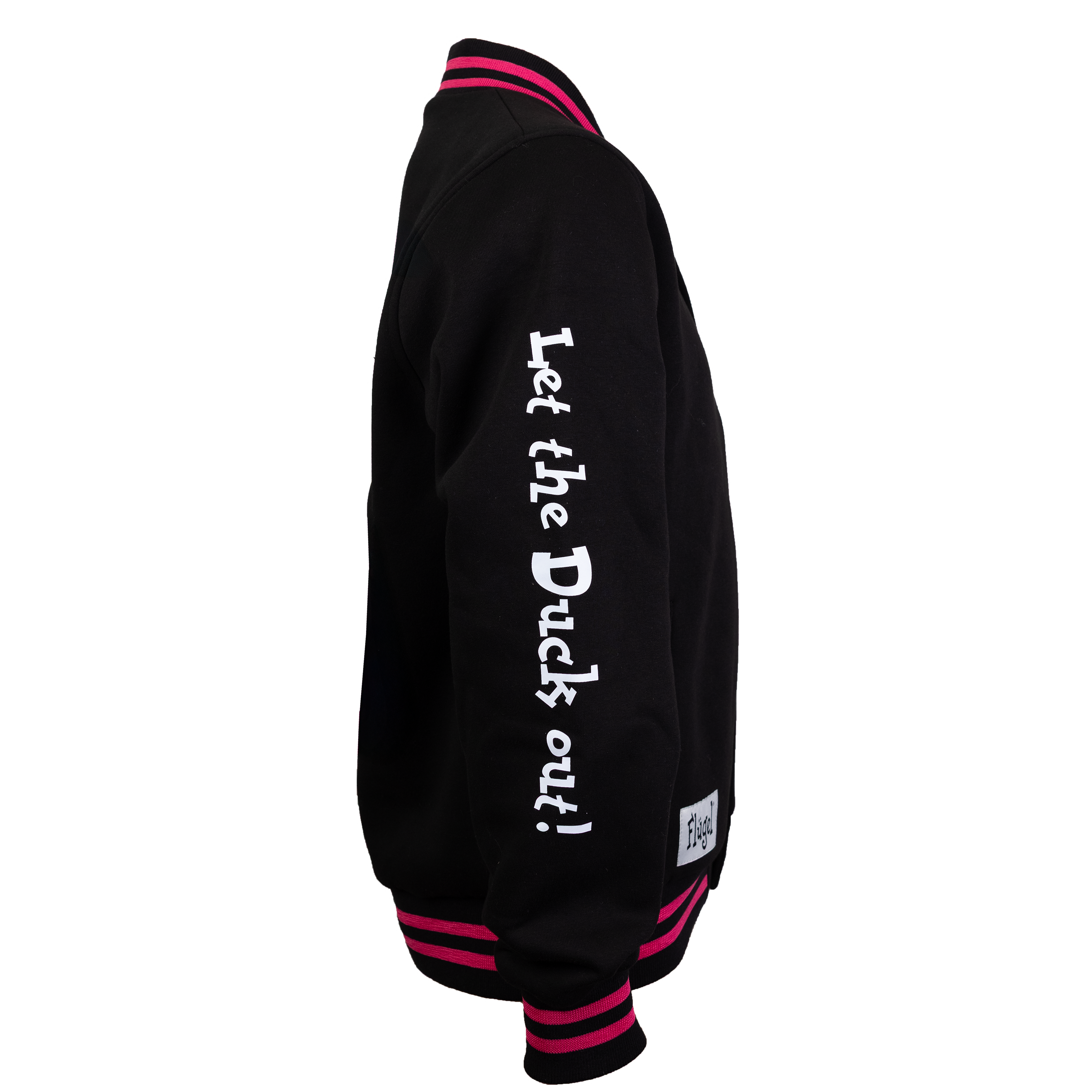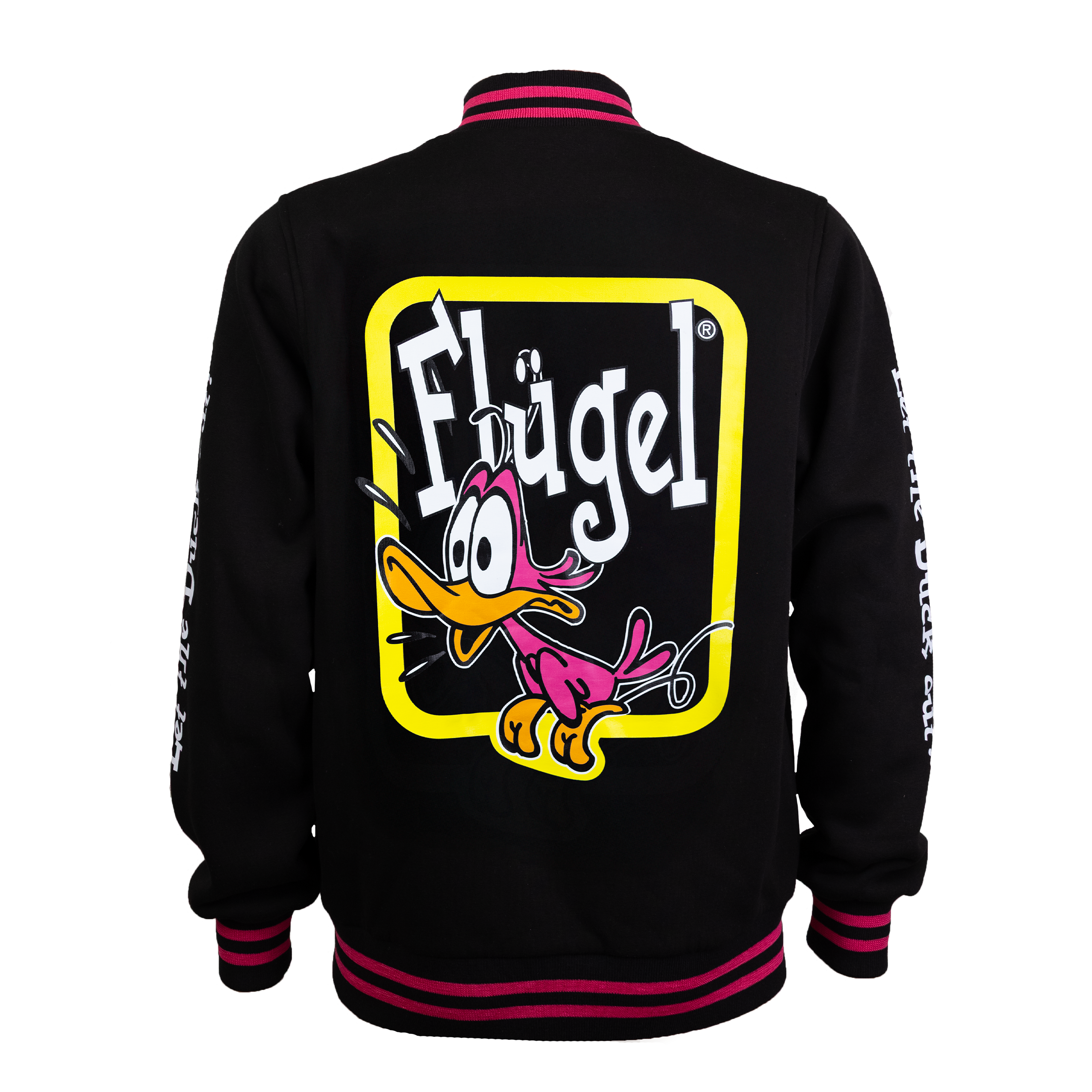 Met dit Flügel jack val jij altijd op. Op de arm staat “Let the duck out”, het iconische eendje is geborduurd op de borst, en de vrolijke roze details maken het helemaal af. De jas sluit makkelijk met drukknopen en heeft twee zakken. Ook de binnenkant van het jack valt op met een speels design, zodat je overal aandacht trekt. Een comfy en opvallend jack voor feestjes, festivals of gewoon dagelijks dragen!